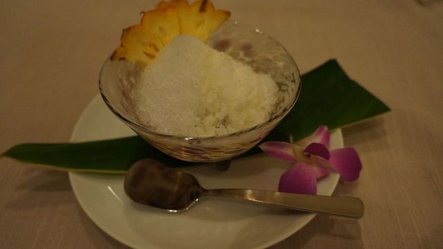 朝食後のデザート。ドラゴンフルーツやスターフルーツ添えのアイス。