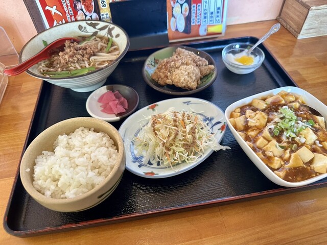 麻婆豆腐定食は、麻婆豆腐、ご飯、唐揚げ2つ、ミニラーメン、お漬物、ミニサラダ、杏仁豆腐と種類が豊富!