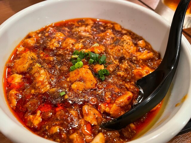 ニラ、モヤシを炒めた具に担々が黒酢と掛け合い、甘さと辛さのハーモニーです。