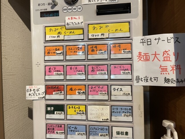 久々の訪問、券売機はかなり根を上げていますが、あごだしラーメンは健在です。