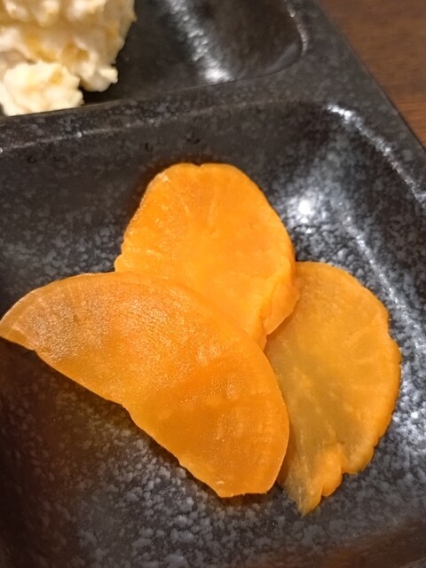 席に着いて少しすると、漬物(大根味噌漬け、胡瓜の麹漬けかな?)とポテトサラダ、とんかつ用のからしが来ました。