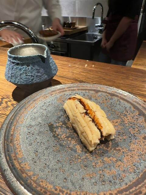 入口からはお寿司屋さんとは分からない、素敵なアンティークのドアがお出迎え。内装も大正モダンな雰囲気で落ち着いたお店で、器やグラスも特徴的なデザインのものが多く、随所にこだわりを感じます。カウンターだけのお店で大将が皆にテンポよくサーブしてくださいます。