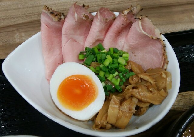 そうしているうちにつけ汁も到着。つけ汁に入ってある具は2種類のチャーシューにネギ・三つ葉・材木メンマです。
