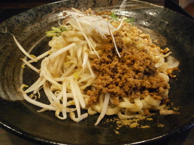麺は平打ちの縮れ麺で、これがタレとよく絡みます。味はピリ辛です。