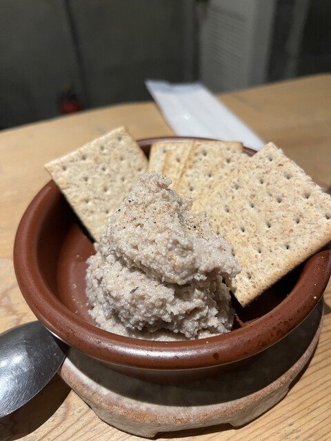 この日は鹿肉が良いと聞いたので、それをラストに据えて、最初は穴熊ともちぶたのリエットを。これをクラッカーに乗せて食べるのだが、臭みのない素直な肉に少しナッツやスパイスの味がしてクラッカーと共に口にして、泡で油の香りを流していく。美味い。