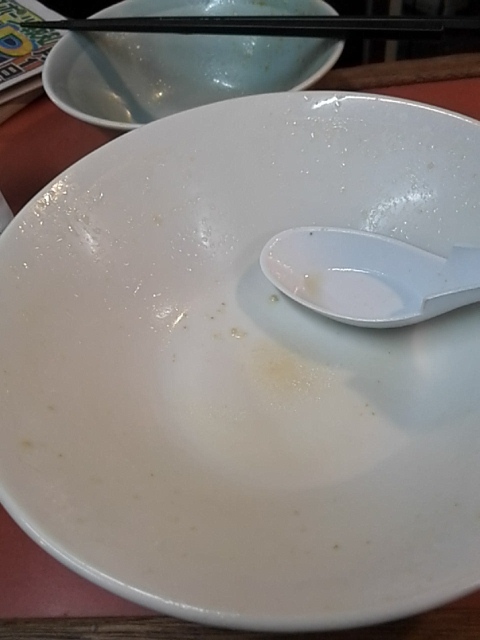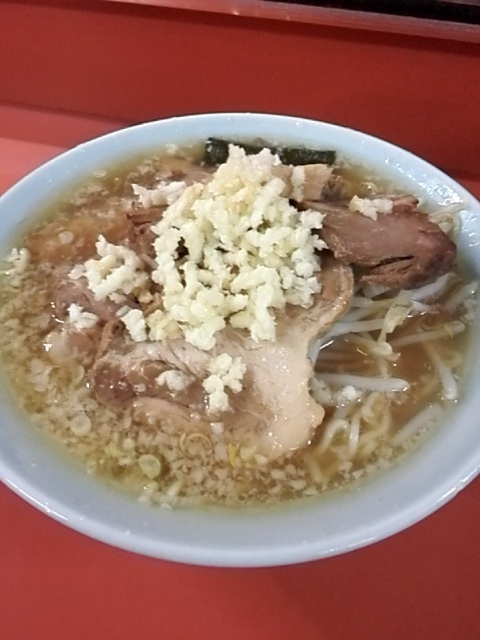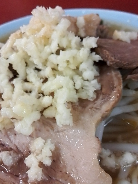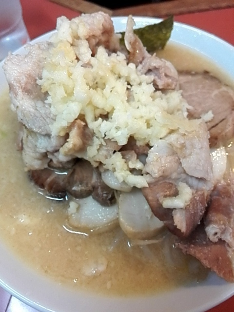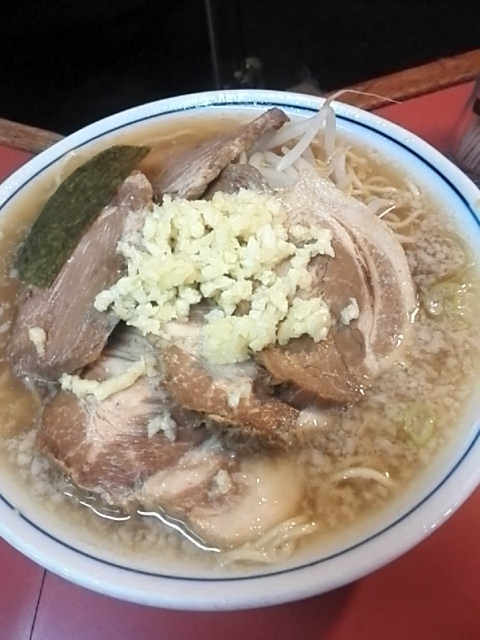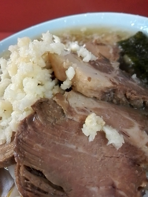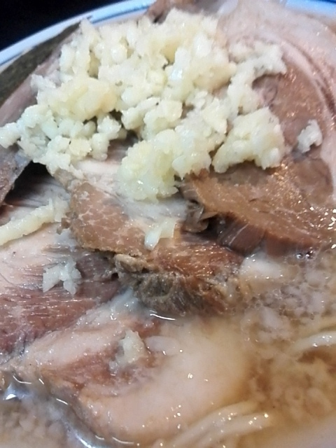 ニンニクチャーシューメン大盛:まずはニンニクの溶けてないところからスープを一口、元味を確かめる。う、うまい。ニンニクのアシストがなくてもすでに旨いのだ。流行りの味ではないのだが、昭和の名店風の、わかりやすい「旨い!」に謎味の込められた、当店ならではの味覚相。麺にあまり特徴のないところなんかもやはり昭和の名店風なんだけど茹で加減はビシッと決まってる。そしてニンニクを溶かして啜ると…なんというかアナーキーな印象にガラッと変わる。まあそれがニンニク効果というものなんだけど。引きずり込まれるようにスープを飲み干してしまう!