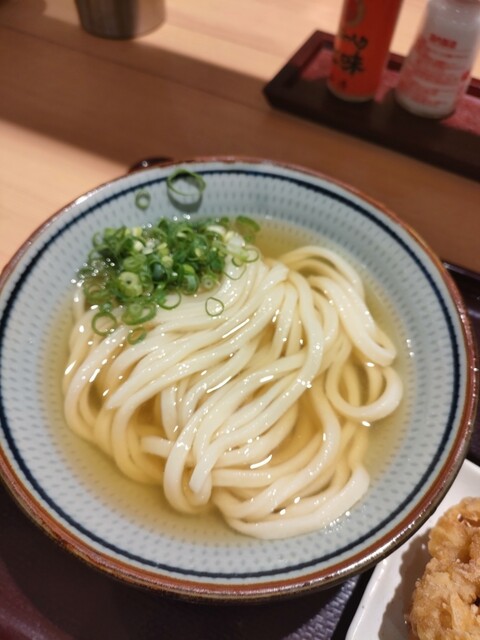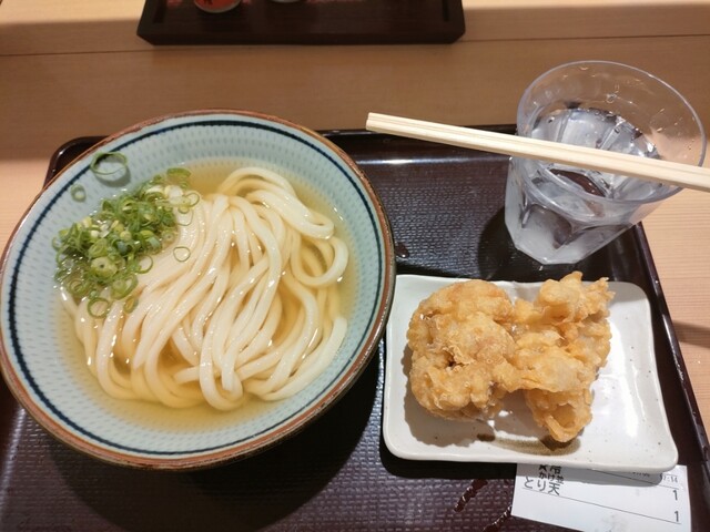 かけうどん+とり天:オオ~、美しい!淡色の出汁に、見るからにむっちりしたうどんが泳ぐ。アタックは一瞬淡味に感じるが、すぐに鋭利なイリコ感に包まれる。おそらく温かけ汁よりもシャープな印象だろう。まだ当店では温かけ汁を試してないので同じものかはわからないのだが、冷やすといりこの立ち加減がこういう感じになる。ひと癖ある感じになっちゃう店もあるが、当店にはそれがない、非常に澄んだおいしさだ。麺はビシッと冷えて弾力的な歯ざわりだ。そうはいっても武蔵野うどん民にとっては柔らかいうちだが、温うどんの最後の一線ッという感じのコシよりも明瞭な歯ざわりとなる。