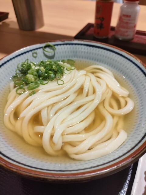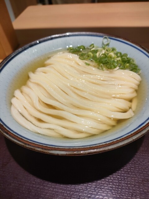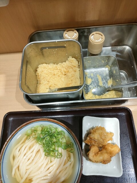 冷かけ✕とり天:世にいうひやひや。冷や出汁はいりこ風味が鮮烈になる傾向があるが、それがまさにこれ!尖った出汁感でありながら苦渋味の金属的な癖はなく、口中いっぱいに旨味が広がる!ビシッと冷たくて爽やか!うどんは冷やすと締まるものだけど、キンキンに冷たくてもなおしなやか。柔らかな肌触りに結構強めのコシ。これはカイカン!とり天は揚げたてとはいかなかったがまだ温かで、肉汁を出汁に与え、自らは出汁をまとって味が上がり…。