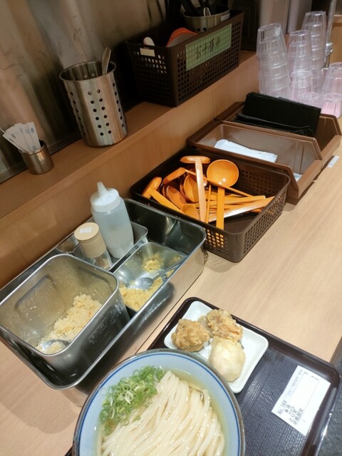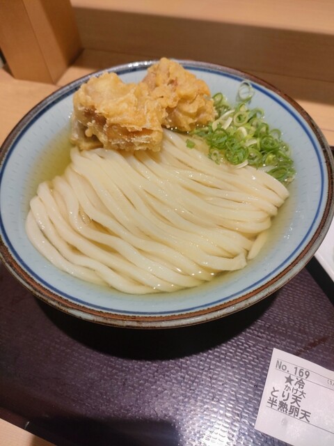 かけうどん大盛(ひやひや)&とり天&たまご天:そろそろ鶏インフルエンザの影響から抜け出たか、各地の讃岐系の店でもたまご天が復活しつつありますね。わずかに細いが冷やしたせいかコシのある麺にこれまた冷やしたせいかいりこ感のグッと乗った出汁!これだけいりこ感がありながら洗練されてる店もなかなかない、というか見たことない。せっかくの澄んだ味を濁らせないようフリー天かすはもらわない。けどどうせあとでとり天をザブーンとダイブさすんだけどね。鶏の味との相乗効果!これも第三の楽しみなのであります。