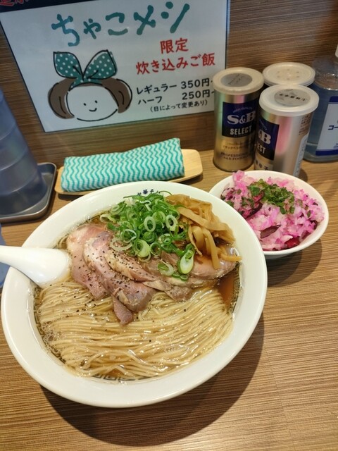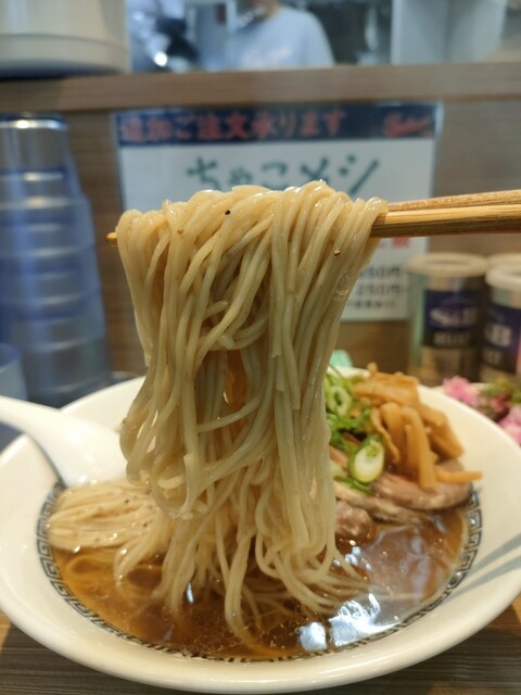豚そば¥900。お店の基本ラーメンにしちゃあ高いが、その旨いことと言ったら…。ラーメンの値付けには1000円の壁が存在するが、美味しさへの対価ということなら1000円と言われても納得だ。もちろん自分、そうしょっちゅう来る訳にはいかないからこんなこと言ってるわけだけど。毎日来るホントのファンはそうはいかないよね。澄んだスープなのだがまとわりつくような旨さが内包されてる。品名は豚そばだから豚骨スープなんだろうけど、鶏のようなヤミツキ味もする。意外と海苔の味と合うのも豚骨出自を物語っているのかも。スパッと歯切れ良いまっすぐな中細麺も、食感といいスープ保持力(っていうのかな?)といい、これ以上無かろうという存在。調理だけでなく、常に満員の客への目配りという点でも行き届いたワンオペのマダム。味だけでなくメンバーの戦闘力というか練度も高く、ホント素晴らしい。