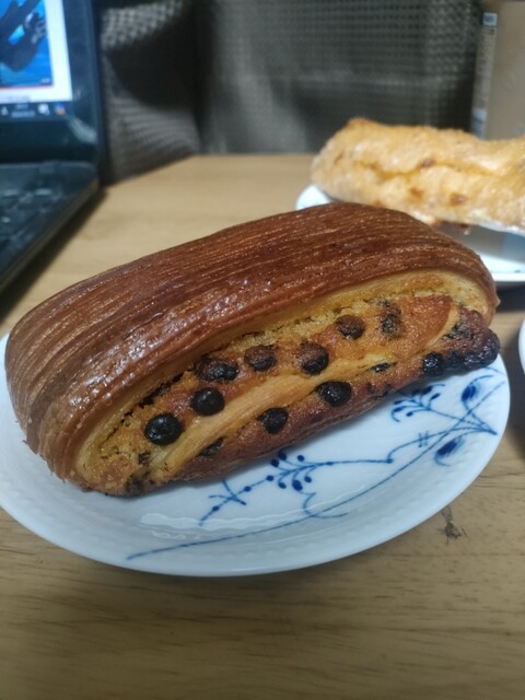 パン・オ・ショコラ:これまたデカいがチョコとの比率を考えますと、ひと口で収まる大きさのが良い気も…。だがこれもウマイ!クロワッサン生地の美質はそのまま。パリパリ散らばるのはご愛嬌。ちなみにパン部の焦げは私の失敗です(^^;