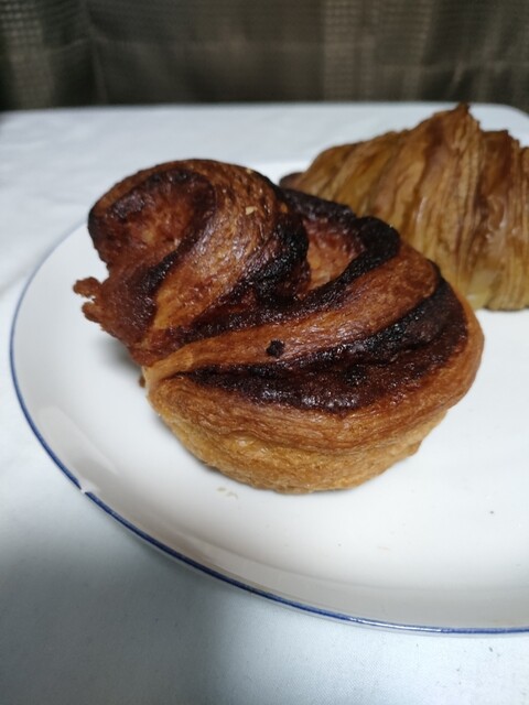シナモンロール:オオ!シナモンとコーヒーの声高に主張するデニッシュ。これまた激甘だが、シナモン効果で奥深い味わい。エスプレッソにブラウンシュガー沈めたようなものに合わせたくなってきた!うちでは淹れられないからどうするか…。