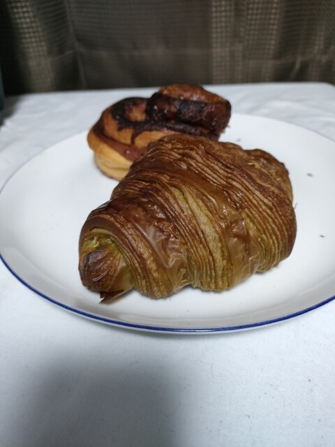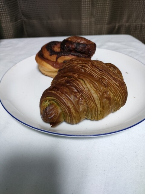 抹茶クロワッサン:これが当店の白眉!ほんわり抹茶の香るクロワッサンにチョコレートの芯。大きくて重くてというクロワッサンだがみっちり濃厚、ラウドな味!