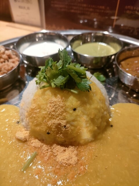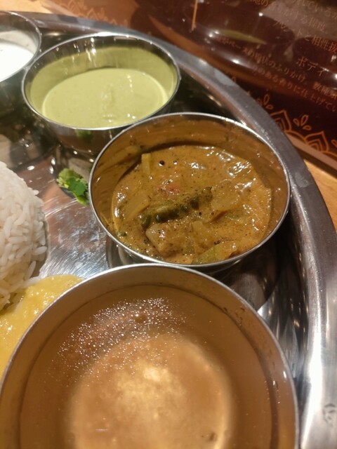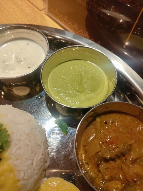 この日はミールスの1メニュー。おもてにはほかにタイ国メニューっぽいのが貼られているが、そういう日もあるというか、夜のバルのメニューだろう。当店はそのハコを昼だけ間借りというとのようです。お若いマスターのワンオペ。2名客でも1人分ずつの提供で手元忙しいなか、相方が好奇心から呟くあれこれに丁寧に答えてくださる。