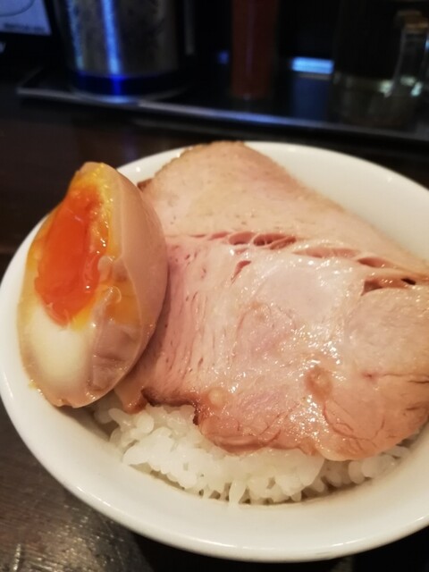 大ぶりのチャーシューをオンザライス!これを楽しみにしていたw。脂身のなく見える方がもうちょいでホロリとなる、しかしむっちり歯ごたえを残した絶妙加減。あっもうちょいスープに浸して温めておけば良かったけど、これもまたスープのすべるようなコクが存分に味わえる…(^^。