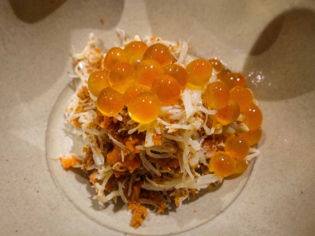 香箱ガニはズワイガニの雌です。ほぐした身,内子,外子を合わせたものに,イクラと酢飯を合わせています。