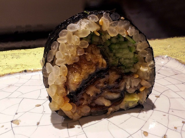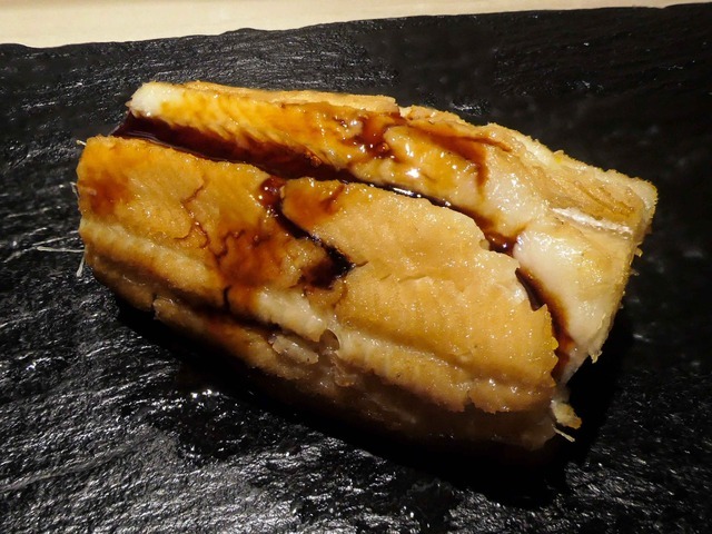 燻してあり,シャリとネタの間に葱と海苔を挟んでいます。