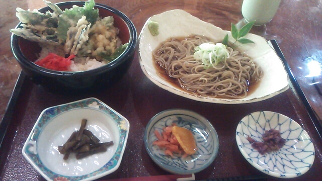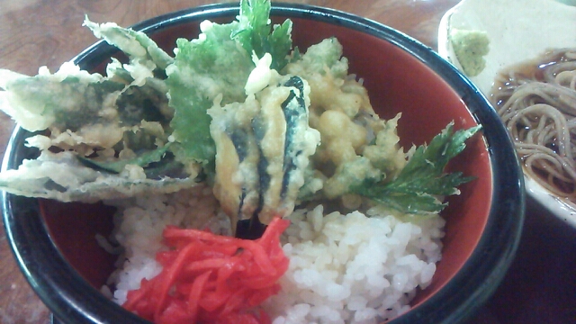 そば三昧は上記の天ぷらに三種の蕎麦が付く。蕎麦は山菜、おろし、とろろ。いずれもツユはかかってないので、お好みの量をかけて頂く。