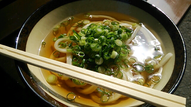 きつね2枚、かまぼこ2枚、ネギ。うどんは冷凍物かな?コシが強く、大人が食べるには良い。