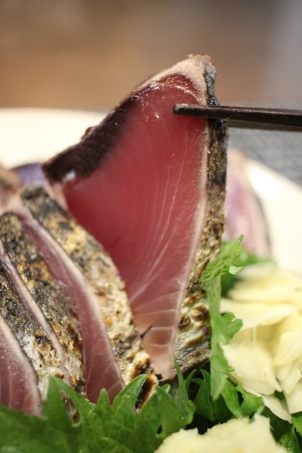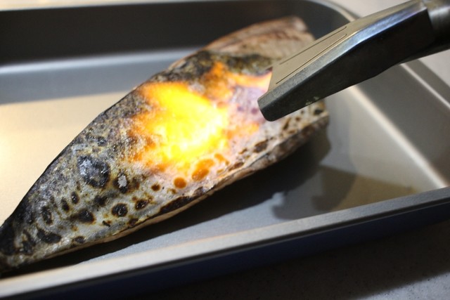 脂がのったカツオなので、炙ると炎か色付いてパチパチと・・・これ、絶対に旨いやつ(≧∇≦)