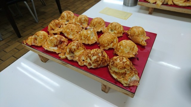 赤い板に整然と並ぶ明石焼き、若干潰れた感じに見えるのはフワフワな証拠だね!!