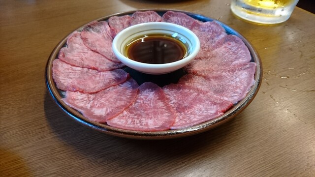 生のタンの薄切りが、キレイに盛り付けられてる。
