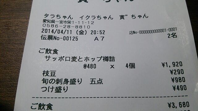 ・生を頼んだら大ジョッキで出てきた。値段を見ても480円だし安いなぁと思ったら、レシートを見たら「麦とホップ」と書いてある。確かに発泡酒なら安いし呑兵衛には嬉しい限り。でもこれって不満に思う人もいるのかな?