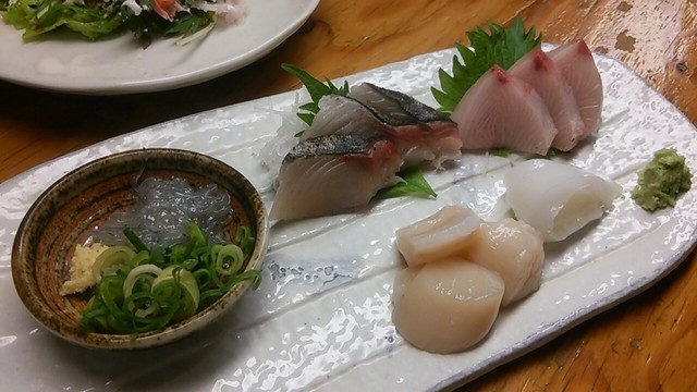 刺身は生シラス、鰆の塩炙り、ブリ、ホタテ、紋甲いかの5点。鰆は店で仕込んだそうで、皮目の香ばしさや塩加減とモチッとした身の食感のバランスが絶妙!!1軒目で食べた鰆とは明らかに質が違った。グルメな友人は紋甲イカを絶賛してた。2軒目の刺盛りが980円でこのレベルと量は非常に嬉しい。