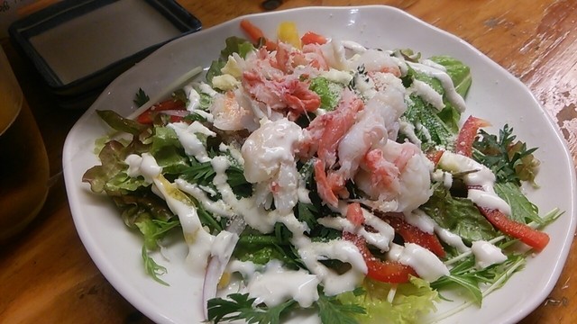 取り合えず瓶ビール550円で乾杯。魚がウリの店なので私は刺身盛り合わせ980円を、蟹が好きなグルメな友人は蟹身の蟹味噌和え680円とずわい蟹のシーザーサラダ580円を注文。