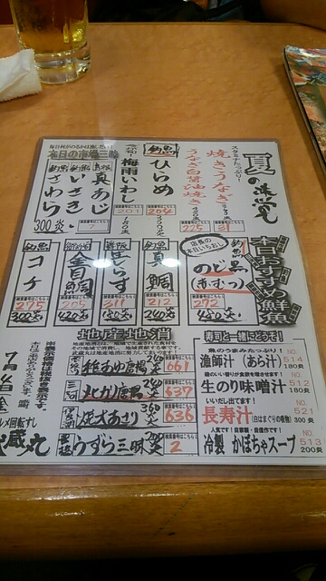 ・本日の市場三昧は左から真あじ、イサキ、さわら。真あじは鮮度が良く臭みは一切ない。イサキはモチモチとしながらも厚く切られてるので食べ応えがある。さわらは皮目を炙ってあるが、直前に炙ったものではなく少々残念。でもこれで300円は満足価格。