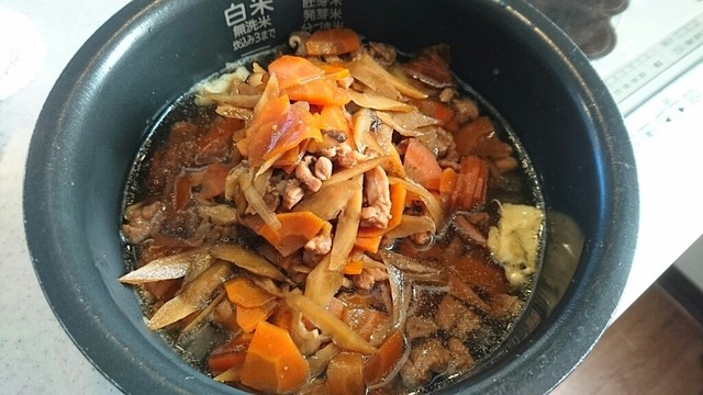 煮汁を入れてから分量通りの水を入れ、具材を投入し炊き上げる。