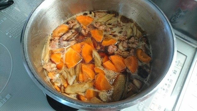 醤油・酒・砂糖で、せせり・ニンジン・ごぼうを約10分炊く。