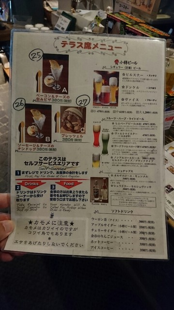 店内の広いテーブル席で飲む事も可能だが、テラス席は基本的にアルコールメニューのみの提供。