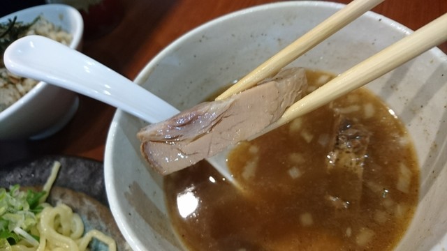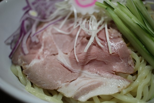 中華そばとは違ってスープの熱が通らないで、つけ麺ではレアチャーシューのベストな味わいを堪能できるね!!
