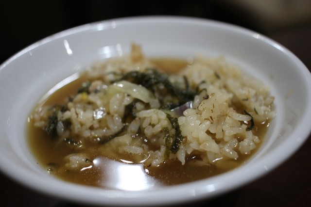 麺と具材を食べ終え、残ったスープを煮干しめしにかけて頂いた。