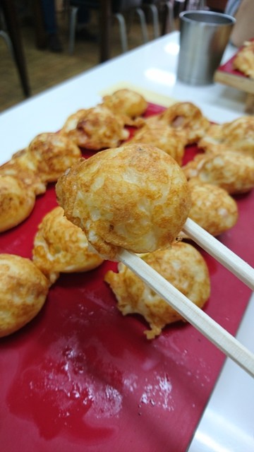赤い板に整然と並ぶ明石焼き、若干潰れた感じに見えるのはフワフワな証拠だね!!