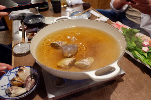 メインのしゃぶしゃぶ、うどん屋拘りの出汁にまずは特大ハマグリで旨味をプラス!!