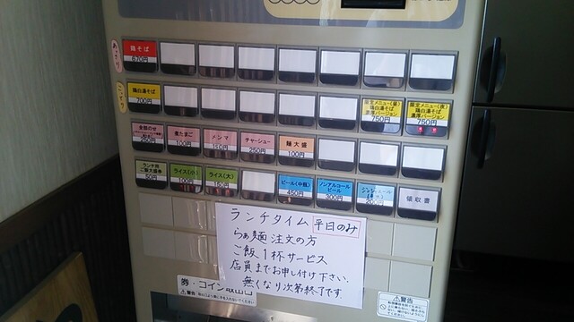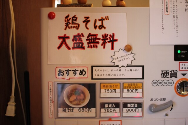 券売機で鶏そば670円、大盛100円、全部のせ250円をポチッと。