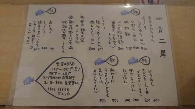訪問したら必ず更新してる「青二犀」だが、4ヶ月も来てないとは(>_<)混んでて諦めた事もあったが、久し振りの訪問は開店と同時に一番乗りだった♪