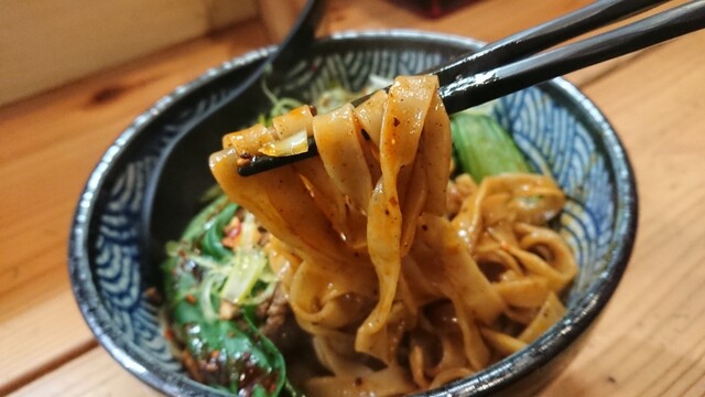 麺は自家製麺。最初にスープに浸かった麺はあまり歯応えは良くなかったが、替え玉した麺は最後までいい歯応えだった。しょうゆラーメンと全く同じ麺だが、担担麺ともよく合ってた。ちなみに今回は入口に「6か月記念 替え玉1回無料」と張り紙がされてた。ラッキー!!