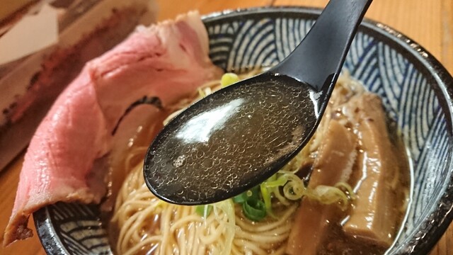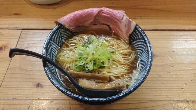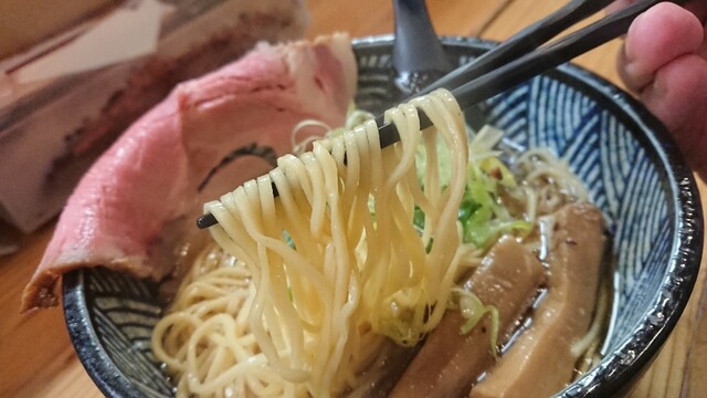 見た目、大きなチャーシューが小さめの丼を覆うように入ってる。丼自体が小さめで深いという事もあるが、麺はほとんど見えない。スープは油が多めかな。でも焦しネギと鶏ガラがマッチしてる。これに合わせる麺は自家製麺で、細めで微妙に平打ちになってる。醤油ラーメンにこの平打ち麺、いい組み合わせ。思わず替え玉を注文しちゃった。