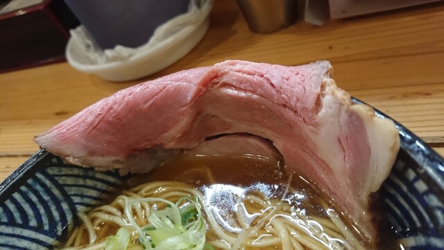 5分程で運ばれてきたが、その瞬間からいい匂い♪清湯のしょうゆと同じ大きな豚のチャーシューが特徴的。前回食べたしょうゆのチャーシューより若干厚く感じた。とってもジューシーで柔らかく、非常に好みのチャーシューである。