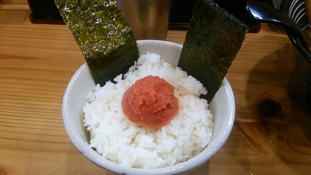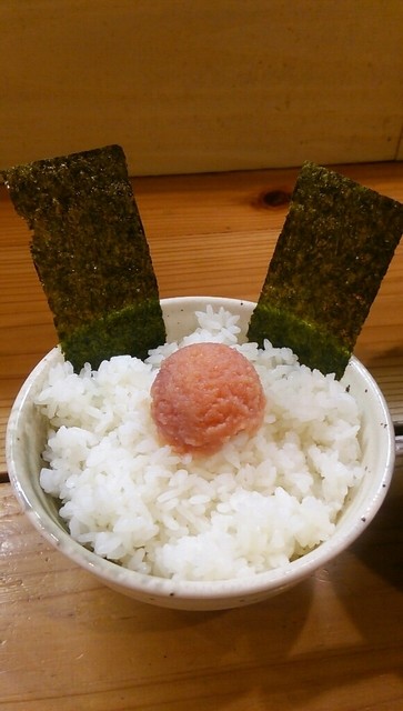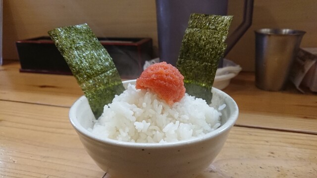 明太子ごはん。茶碗はちょっと小さめだが、たっぷりのご飯。この上に明太子が乗り、味付け海苔が2枚添えられてる。このようなメニューを頼んでも明太子が少ない店は結構あるが、ここは違う。ご飯の量に対してちょっと多めの明太子が嬉しい。