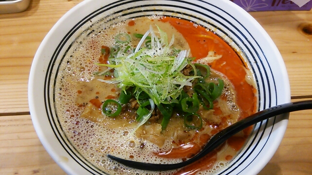 しょうゆラーメンと同じで真ん中に2種の切り方で切られたネギがドカッ。スープは見た目クリーミーそうだが、辣油のインパクトもある。一口飲むと胡麻の風味が口中に広がる。濃度もそこそこ濃い。辣油が多そうだったので結構な辛さかと思ったが、激辛ではない。でも一気にすすると咽るので注意が必要。
