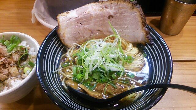 今回は久し振りにピリ辛旨の坦々麺を食べようかと思ったが、仕事の休憩時間につき汗ダクになる覚悟が足りず、定番のしょうゆらーめん650円と大人のチャーシュー丼300円を注文。