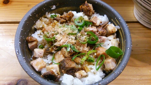 大人のチャーシュー丼はメニューに生姜が効いてると書いてあったが、想像してたよりは効いてなかった。恐らく切れ端のチャーシューだが、量も多くネギや鰹節とも合ってた。ただ、若干タレが少ないかな。もう少し多くても良いと思った。