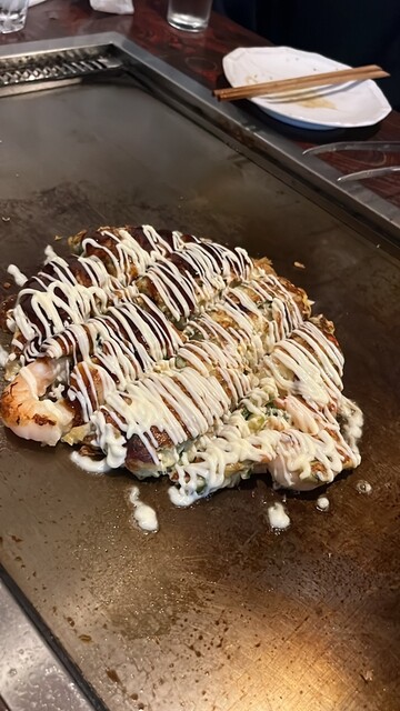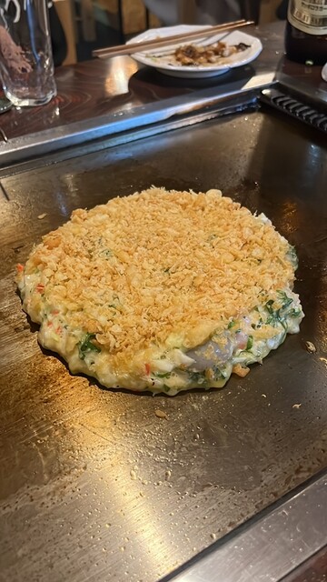 海老、ホタテ、豚肉、紅生姜、大葉などが入った生地を目の前で上手に焼いてくれるんだけど、つなぎの粉が入ってない!?独自の生地なの(^○^)
