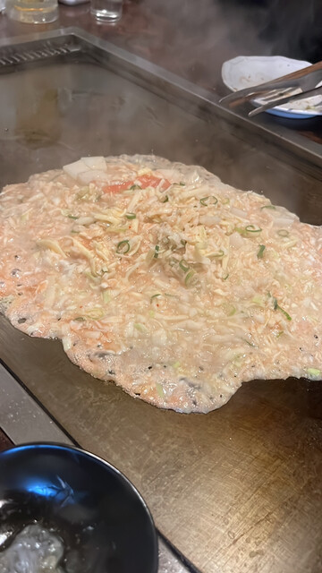 明太餅チーズを生地に全部混ぜて、土手を作らないで仕上げて行くもんじゃで、これも他のお店のもんじゃと違って重たくなくてソースを使ったもんじゃではやくて、出汁の効いた出汁もんじゃで本当最高でした。