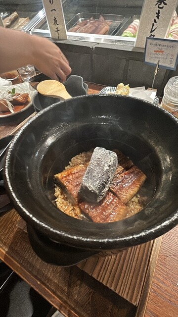 蓋を開けるとまさかの鰻の上に炭が乗っててびっくり!!最後に店員さんが炭の香りを出すために炭でさらに表面を焼いてくれるという素晴らしい演出です。それをご飯と鰻を混ぜ混ぜとしていただきました〜。鰻のタレがしっかりついている土鍋ご飯は美味しすぎました。後半はひつまぶしとして出汁を入れて食べるという贅沢っぷり!