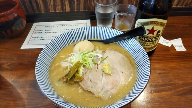 • 味玉味噌 1150円、赤星(中瓶) 700円